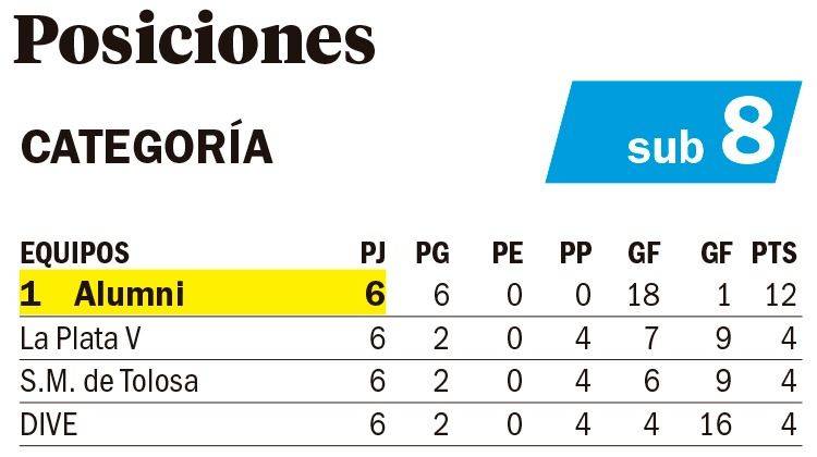 Por ejemplo, en la categoría Sub 8, la más chicas de todas, las campeonas resultaron ser las nenas de Alumni, de Los Hornos, que obtuvieron las seis victorias que duró el torneo, sumó puntaje ideal y le sacó ocho puntos de diferencia a sus perseguidores. La Plata V, San Martín de Los Hornos y DIVE.
