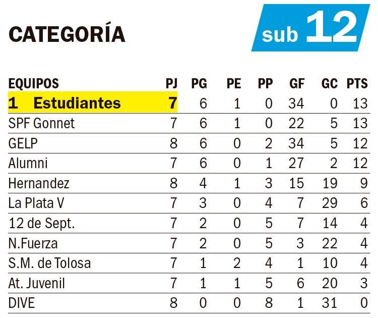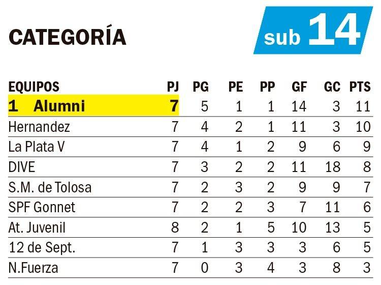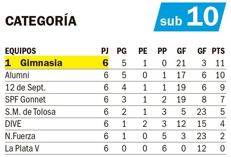 En las otras tres divisiones, la definición podría darse en la jornada del próximo fin de semana, teniendo en cuanta que la Sub 10 jugará la última fecha. Acá, Gimnasia lidera las posiciones por un punto por encima de Alumni, el escolta.