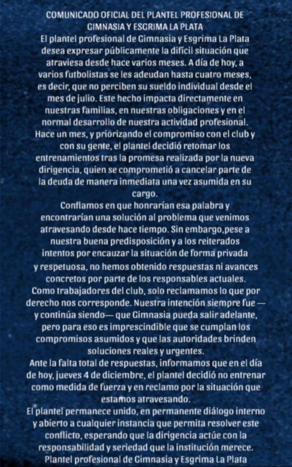 Con el título: "COMUNICADO OFICIAL DEL PLANTEL PROFESIONAL DE GIMNASIA Y ESGRIMA LA PLATA", la nota expresa: "El plantel profesional de Gimnasia y Esgrima La Plata desea expresar públicamente la difícil situación que atraviesa desde hace varios meses. A día de hoy, a varios futbolistas se les adeudan hasta cuatro meses, es decir, que no perciben su sueldo individual desde el mes de julio. Este hecho impacta directamente en nuestras familias, en nuestras obligaciones y en el normal desarrollo de nuestra actividad profesional".