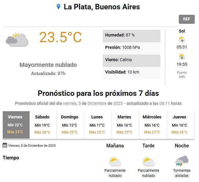 El calor agobiante sigue este viernes en La Plata y alrededores, aunque podría llover hacia la noche según informó el Servicio Meteorológico Nacional.