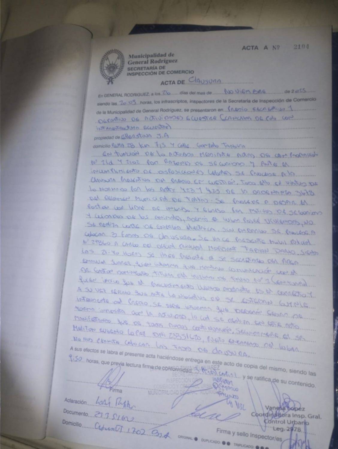La municipalidad dispuso la clausura preventiva del predio por incumplimiento de obligaciones legales, con intervención del Juzgado de Faltas N°2. Sin embargo, por varias horas los responsables de Ellerstina decidieron continuar con la actividad clandestina, al parecer por tratarse de un “evento privado”.