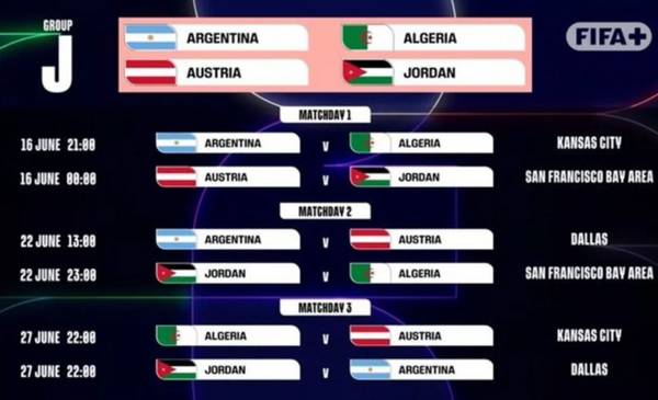 Y, finalmente, cerrará su actividad en la fase inicial de la cita mundialista contra Jordania el sábado 27 en el Dallas Stadium a las 23hs (hora Argentina).