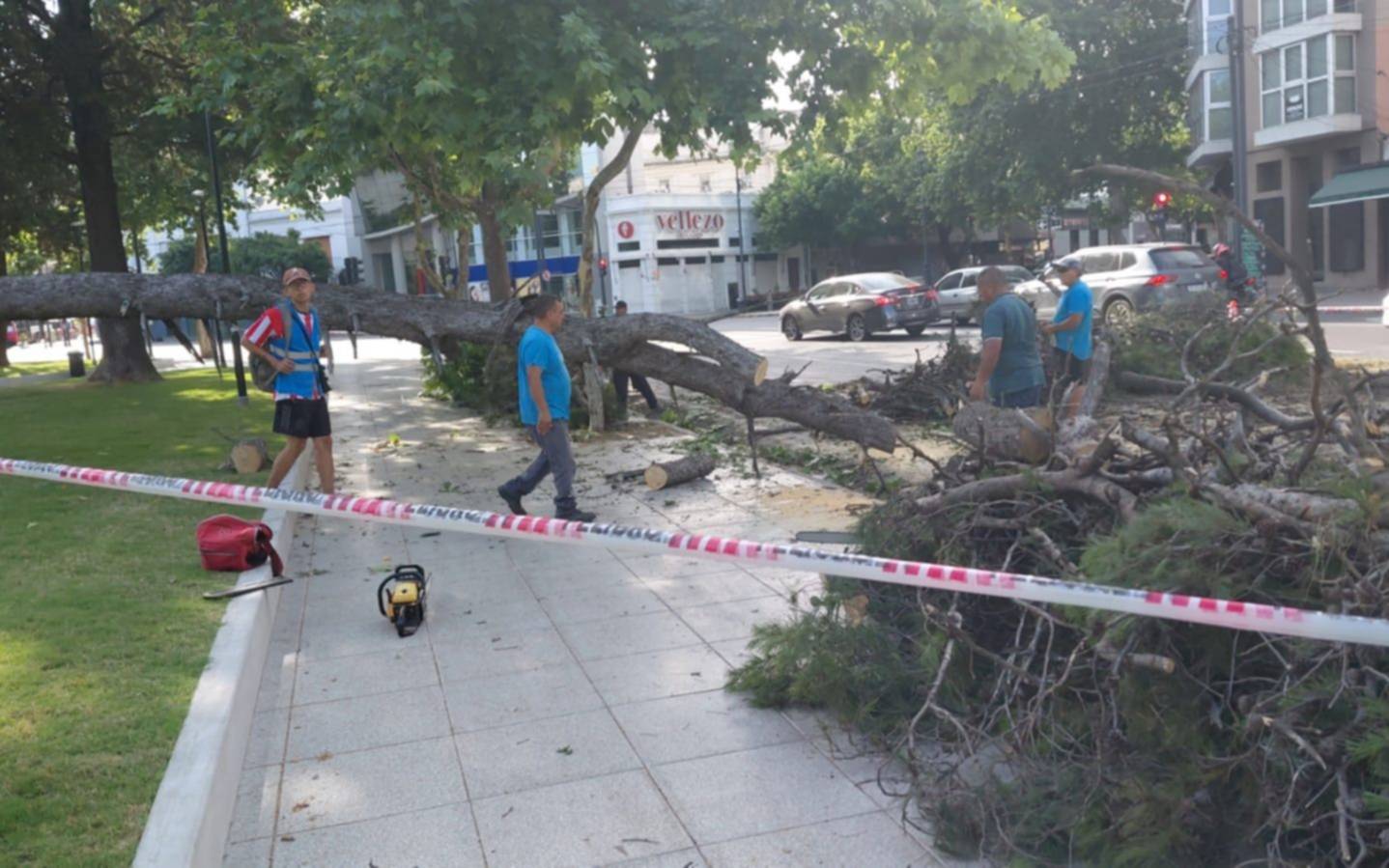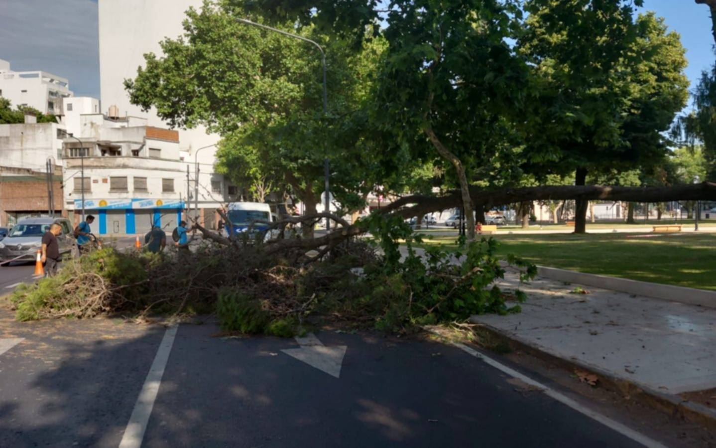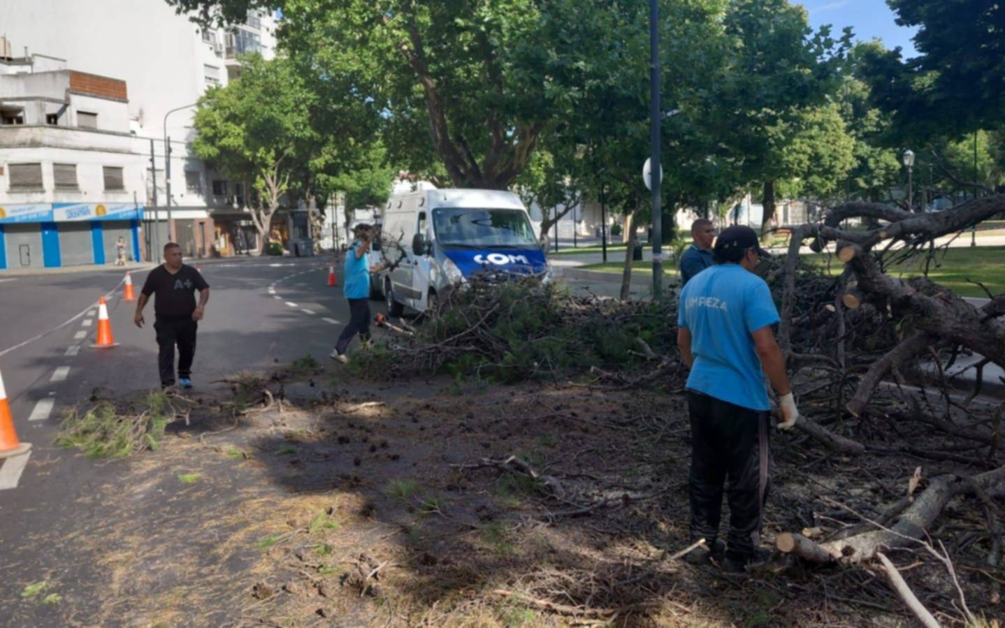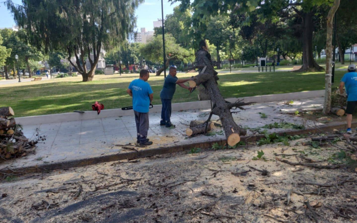Cerca del mediodía la cuadrilla municipal del equipo de la Dirección de Casco Urbano concurrió a Plaza Italia y desplegó el operativo para solucionar el problema y normalizar la zona.