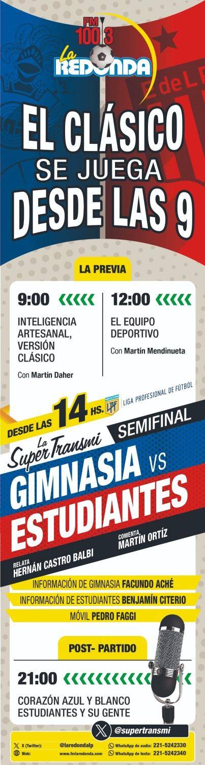 14hs - La Súper Transmi Semifinal. relata Hernán Castro Balbi y comenta Martín Ortíz. Con Facundo Aché con la información de Gimnasia y Benjamín Citerio con la de Estudiantes. Además el móvil de Pedro Faggi.