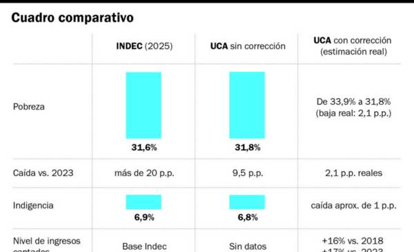 La publicación del último indicador de pobreza del Indec tensionó nuevamente uno de los debates más sensibles del país. La cifra oficial -31,6% de pobreza y 6,9% de indigencia en 2025- muestra una mejora abrupta respecto del 52,9% que se registraba un año atrás, luego del shock inflacionario y la recesión del final de 2023. Con semejante caída estadística, el Gobierno celebró un alivio que, en términos históricos, parece contundente. Sin embargo, para la Universidad Católica Argentina (UCA), el panorama es menos lineal: sí hubo una baja, pero su magnitud sería sensiblemente menor.