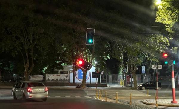 Frentistas de la zona y conductores coinciden en marcar como “un peligro” un semáforo que quedó colgando frente en la esquina de 1 y 54. “Tengan cuidado, el semáforo está colgando, a punto de cortarse el cable que lo sostiene”, se indicó desde esa intersección, temiendo que ocurra un accidente.
