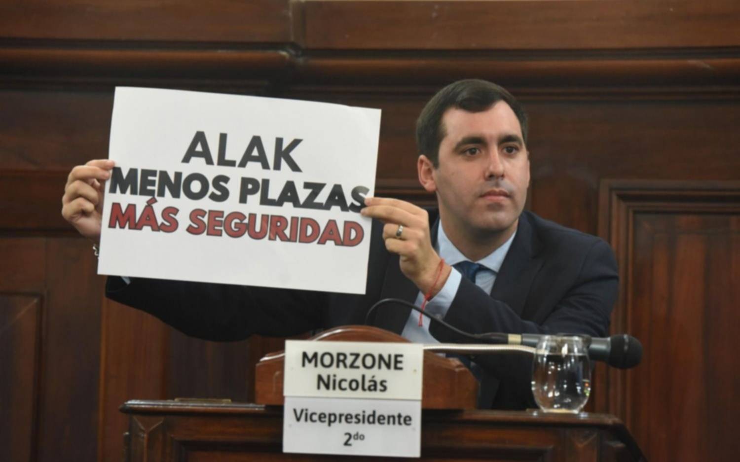El edil de esa bancada Nicolás Morzone fue más allá al sostener durante el acto de apertura de sesiones una pancarta con la leyenda: “Menos plazas, más seguridad”.
