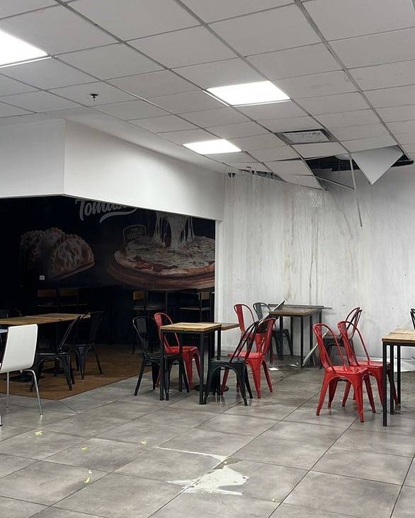 Una postal que generó un gran susto es una catarata de agua que provenía desde el techo y caía a través de las luminarias en un sector de cajas registradoras de un local de comidas rápidas.
