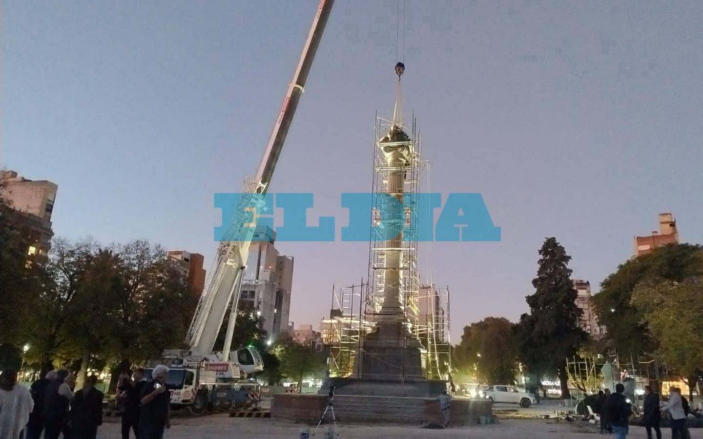 En el marco de la reconstrucción de uno de los espacios verdes neurálgicos de La Plata -que por estas horas los trabajos se intensifican en la pavimentación de su contorno- ayer por la tarde se comenzaron a ver las primeras maniobras para colocar la base del monumento. Las mismas culminaron pasadas las 21, donde finalmente el Águila fue nuevamente colocada en el centro de la plaza. Cabe resaltar que se trató de una labor muy compleja y precisa, en la que participaron varios operarios y grúas especializadas.