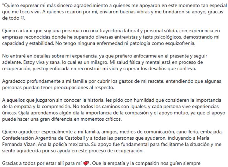 "Agradezco profundamente a mi familia por cubrir los gastos de rescate, a mis amigos, medios de comunicación, cancillería, embajada, Confederación Argentina de Cestoball y todas las personas que ayudaron, incluyendo a María Fernanda Vizan, Ana la policía mexicana. Su respaldo fue fundamental para facilitarme la situación", concluyó Zerda, que había sido vista por última vez el 6 de abril.
