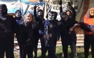 A su vez, los mismos tenían también chalecos antibalas con el escudo de policía y gorras tipo kepi, visualizando de fondo una pared de ladrillos huecos donde cuelgan banderas de la Nación Argentina con inscripciones varias.