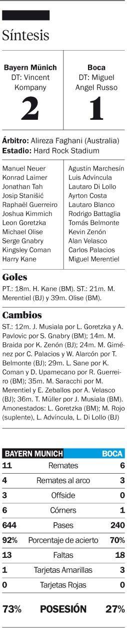 Boca murió de pie. Con la frente alta. Perdió 2-1 ante Bayern Munich, se complicaron las chances de clasificar, pero dejó una muy buena imagen. Los últimos minutos fueron fatales, porque cuando había controlado el partido, tras el empate de Miguel Merentiel, llegó el golpe de Olise que lo dejó nocaut. Ahora, deberá golear el martes al Auckland City y esperar que el Benfica pierda para clasificar.