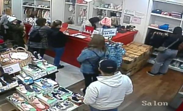 Las tres fingen observar la mercadería hasta ubicarse frente a una pila de cajas ubicada debajo de la caja registradora, fuera de la vista de las empleadas pero en el centro de la imagen de la cámara de seguridad. En un instante, la joven toma una caja y sale del comercio con total impunidad.