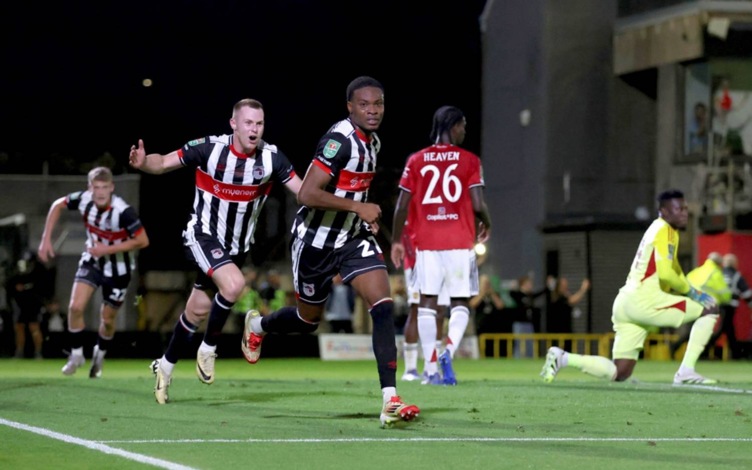 Grimsby arrancó con todo y sorprendió con dos goles tempraneros: el primero de Charles Vernam a los 22 minutos y el segundo, ocho minutos después, por parte del ex juvenil del United, Tyrrell Warren, aprovechando sus errores defensivos. Al descanso, los locales estaban 2-0 arriba.
