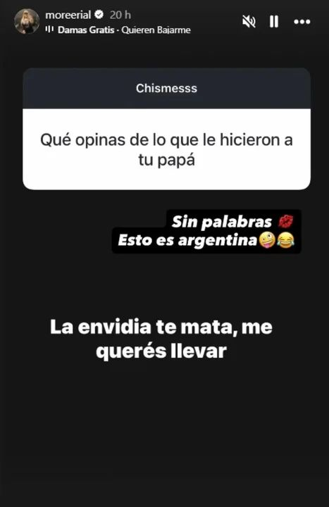 Morena les pidió a sus seguidores que le hicieran preguntas y, como era de esperarse, le consultaron por la situación de Jorge Rial. “¿Qué opinas de lo que le hicieron a tu papá?”, preguntaron, y ella contestó: “Sin palabras. Esto es Argentina”. De fondo puso el tema “Quieren bajarme”, de Damas Gratis.