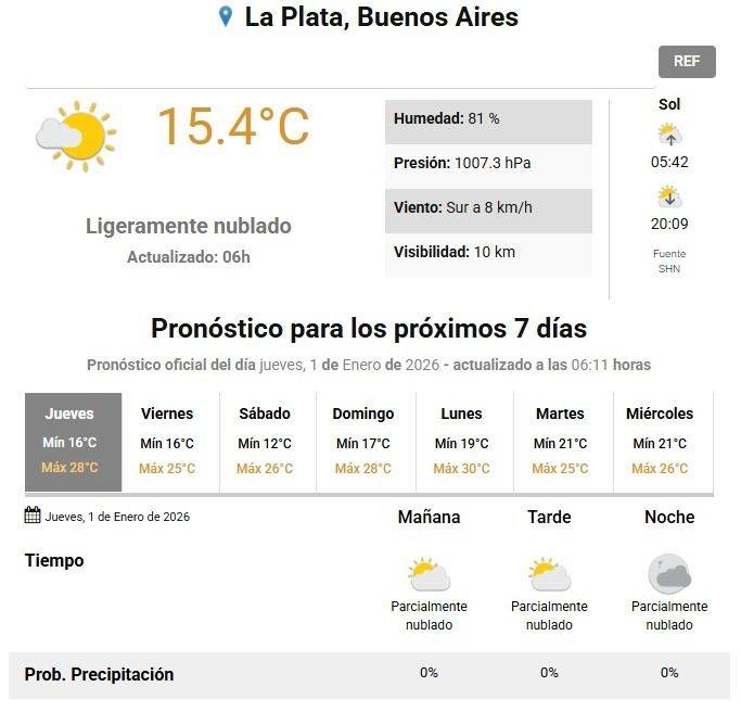 Lo cierto es que el nuevo año trae buenas noticias porque el SMN anuncia que hoy llega el alivio y no se registrarán temperaturas extremas como las de los últimos días. El organismo pronostica para este jueves 1ro de enero una máxima de 28 grados, con cielo parcialmente nublado y vientos que podrían alcanzar los 50 kilómetros por hora, que soplará del sudeste y rotará al este.