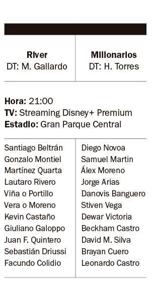 Para el compromiso contra Millonarios, Gallardo aún no definió el equipo, aunque podría incluir desde el arranque a dos de sus recientes incorporaciones: Matías Viña en el lateral izquierdo y a Fausto Vera en el mediocampo.