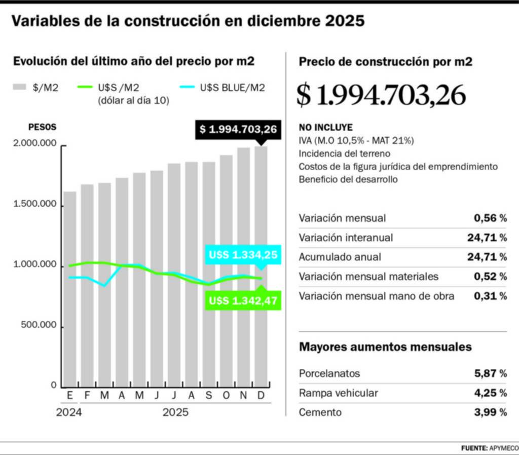El metro cuadrado subió 0,56 por ciento en diciembre pasado y su costo llegó a 1.994.703,26 pesos. En todo 2025 la suba del metro cuadrado para construir fue del 24,71 por ciento, según difundió la Asociación de Pequeños y Medianos empresarios de la Construcción (Apymeco), en su informe mensual.
