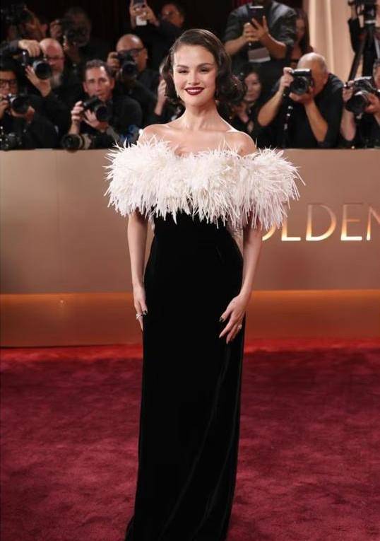 El verdadero acento estuvo en la parte superior del diseño, donde volantes estructurados, casi en forma de abanico, rodeaban los hombros y el escote. Ese detalle aportó volumen, movimiento y un aire escultórico que transformó una silueta clásica en una pieza memorable. El resultado fue una referencia directa al Old Hollywood, pero reinterpretada desde una sensibilidad actual, más afilada y segura.