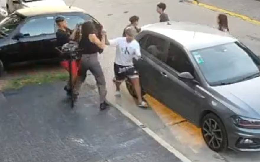 Según se observa en las imágenes captadas, las víctimas fueron sorprendidas por la espalda por la banda de delincuentes cuando se disponían a ingresar a su vehículo. En una maniobra coordinada, uno de los asaltantes le sustrajo las pertenencias a una de las mujeres y se las entregó a un cómplice. Simultáneamente, otro de los integrantes del grupo abordó a la segunda víctima, tomándola primero de su cartera y luego del cabello para arrojarla brutalmente contra el suelo de la vereda con el fin de alejarla del automóvil.