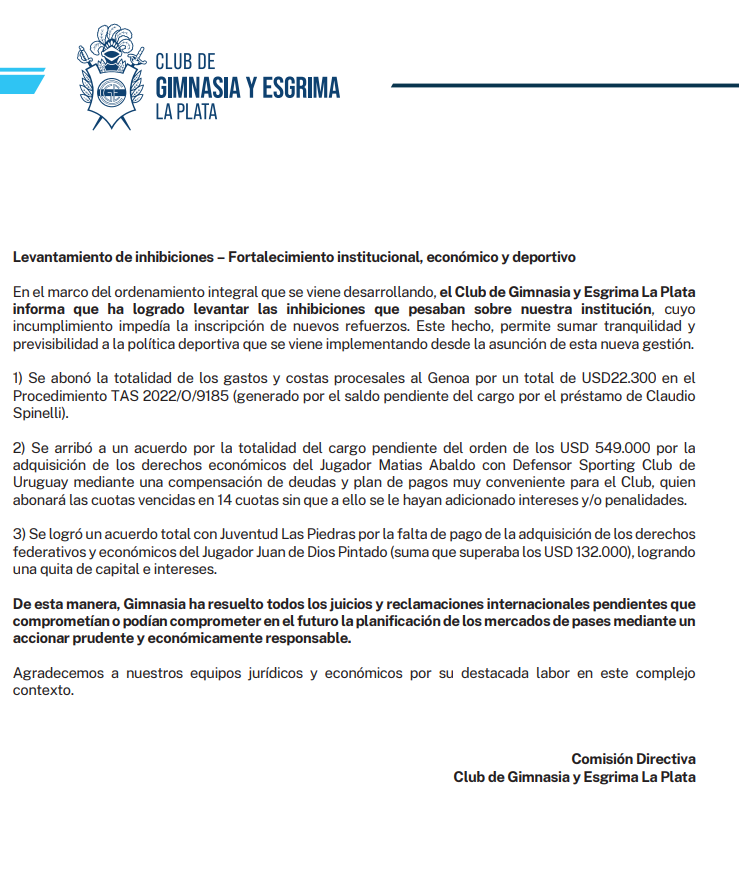 Con estas acciones, Gimnasia resolvió todos los juicios y reclamos internacionales pendientes que comprometían, o podían comprometer a futuro, la planificación deportiva del club. Desde la dirigencia remarcaron que este proceso se llevó adelante mediante un accionar prudente y económicamente responsable, priorizando la estabilidad institucional.