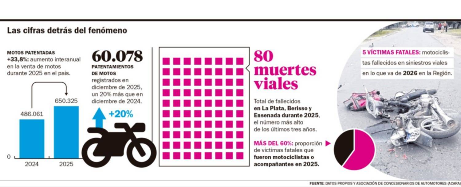 La Plata, Berisso y Ensenada cerraron el año pasado con 80 fallecidos en siniestros viales, el número más alto de los últimos tres años. Y más del 60% de esas muertes involucró a motociclistas o acompañantes. Para Corazones Azules, el fenómeno se nutre de diversas situaciones que pueden observarse a diario en las calles de la ciudad.