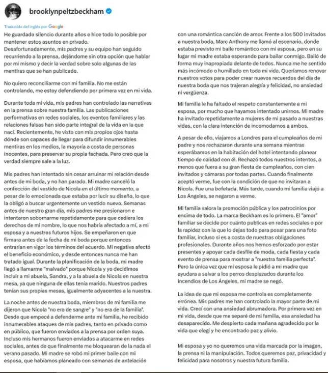 En un extenso mensaje publicado en sus redes sociales, el joven de 26 años detalló cómo, en su opinión, sus padres intentan sabotear su relación con su esposa, la actriz estadounidense Nicola Peltz Beckham.