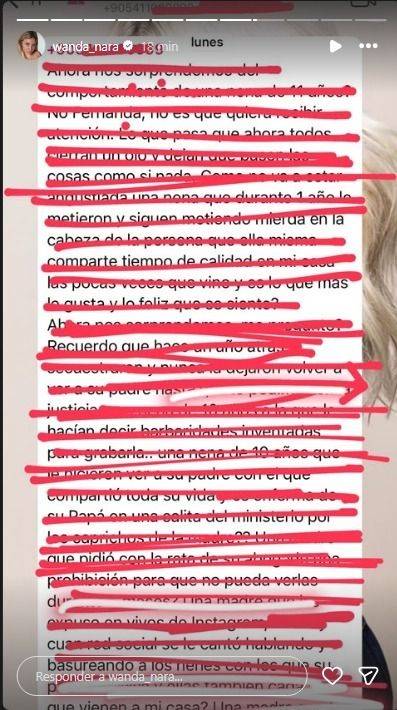 Esto hizo estallar a Icardi, quién parece que no tuvo tiempo ni de salir del estadio para responder a su ex pareja. Luego de sostener que era una vil mentira que hablaban, sostuvo que “nunca jamás será mi familia” y “es solo la madre de mis hijas”.