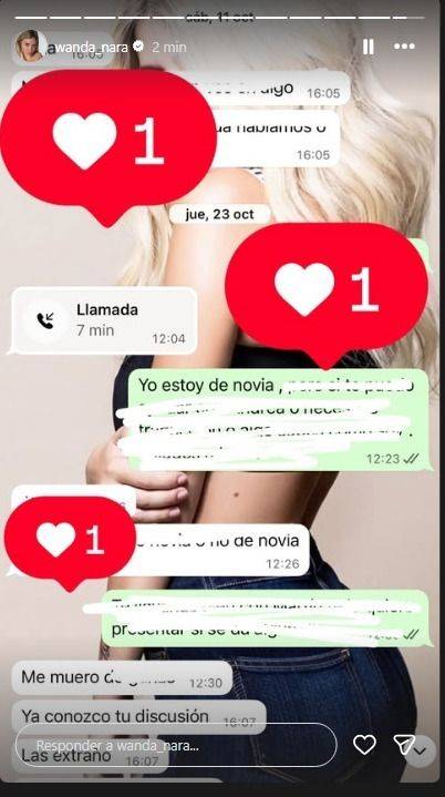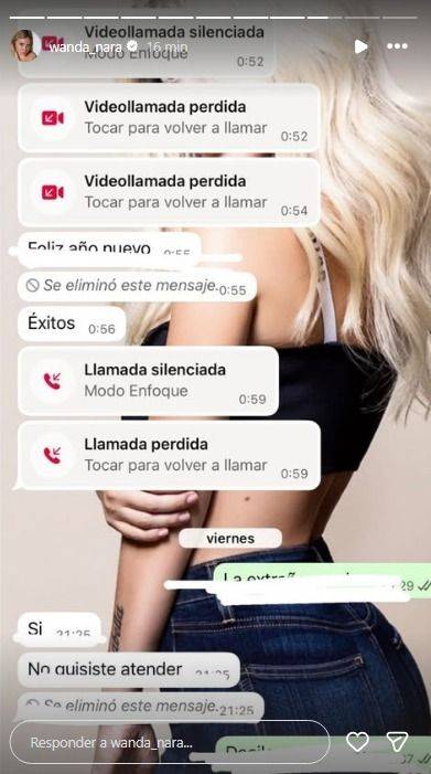 En otro de los pasajes, Icardi le manda "Feliz año" y responde con un "Me muero. Ya conozco tus discusiones. Las extraño", cuando la madre de sus hijas le comenta que estaba de novia con Martín Migueles. Una vez más, Wanda Nara respalda sus declaraciones a la prensa con pruebas en sus redes sociales.