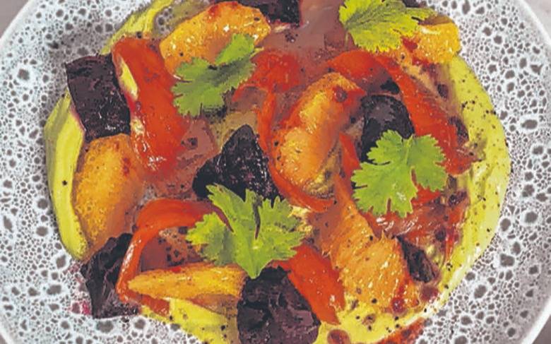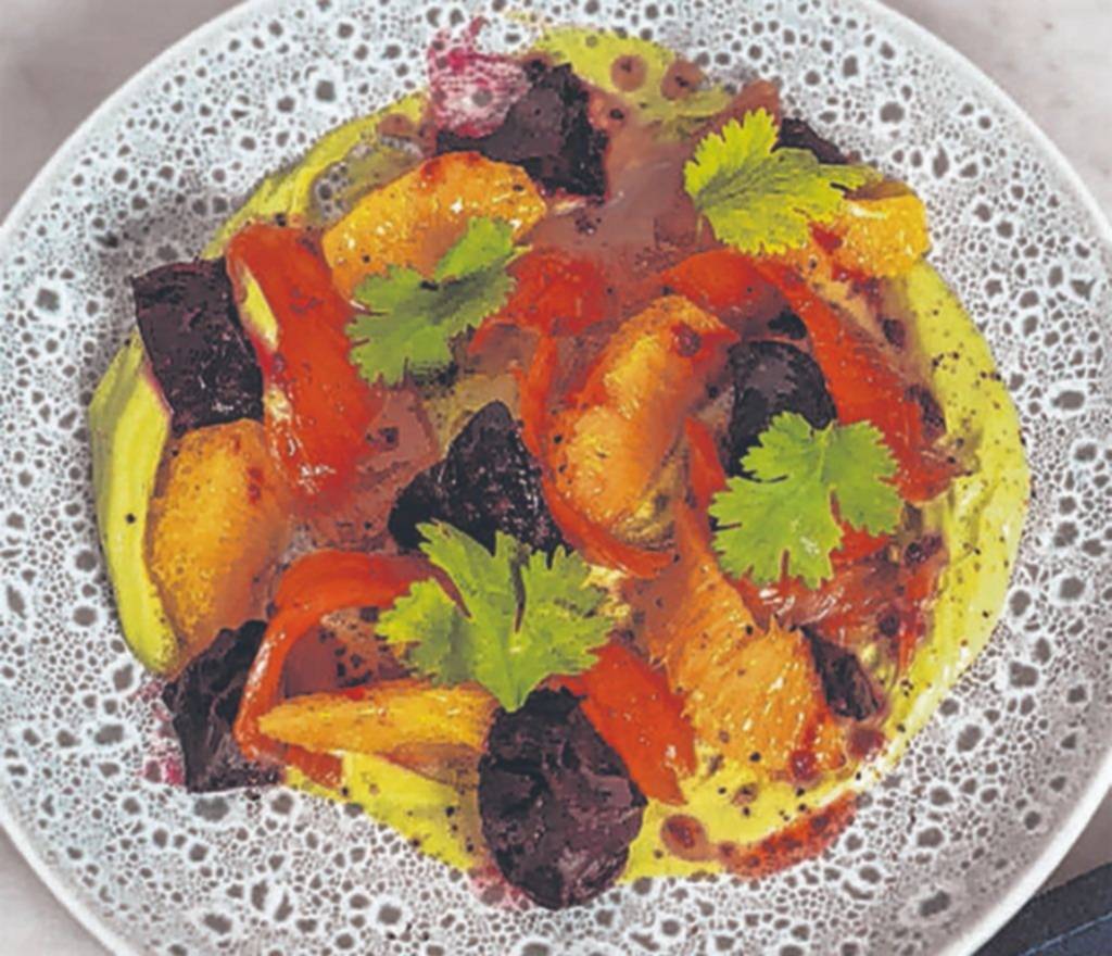 8Para emplatar, disponer una base de cremoso de palta, colocar la trucha en láminas, sumar remolachas y naranja. Terminar con cilantro fresco, aceite de oliva, sal y pimienta. Servir de inmediato.