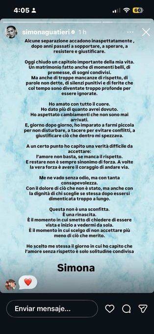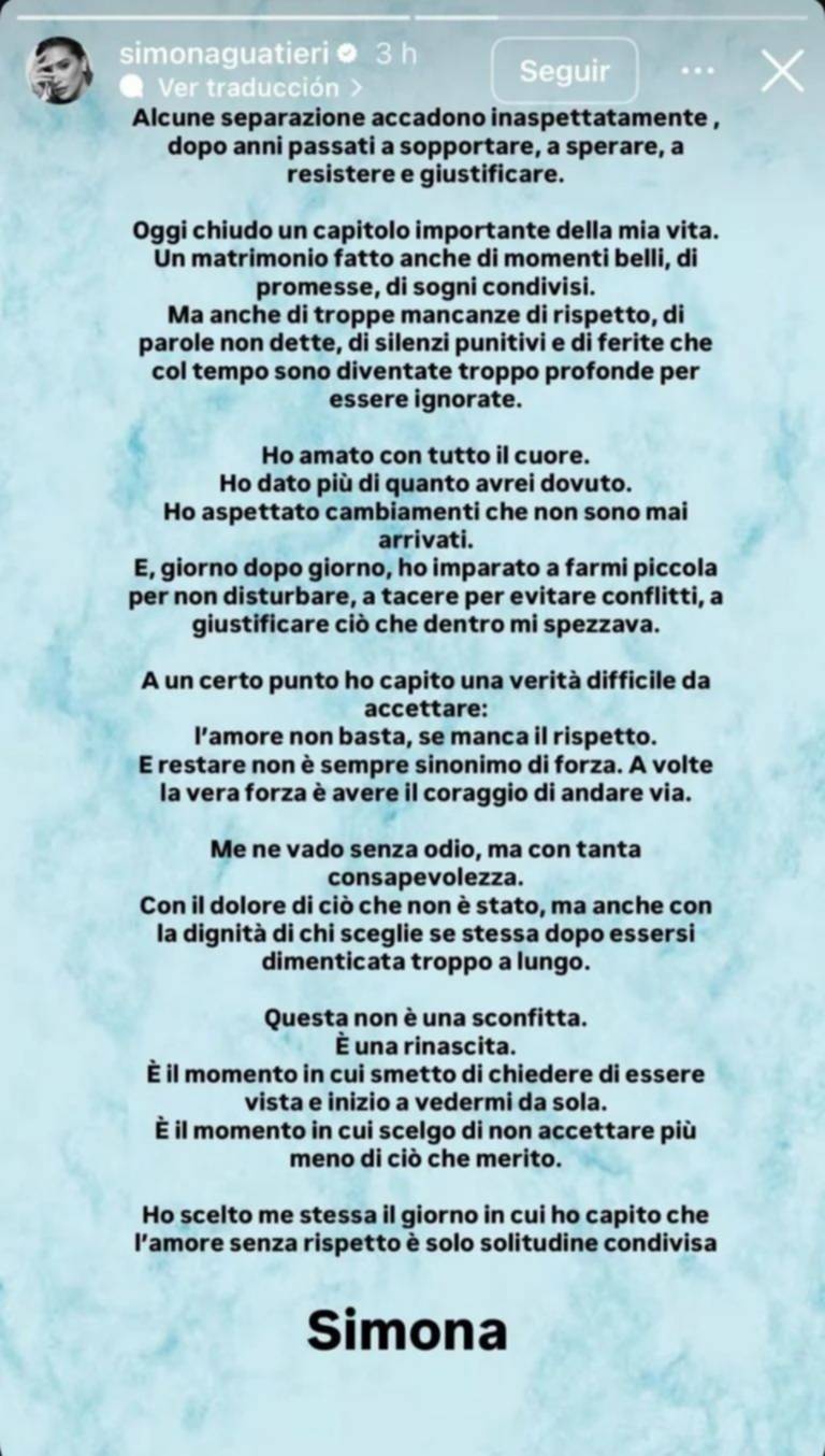 Simona también reflexionó sobre la importancia del respeto dentro de una relación, dejando en claro la razón principal de su decisión: "En un momento dado, comprendí una verdad que me costaba aceptar: el amor no basta sin respeto. Y quedarse no es siempre sinónimo de fuerza. A veces, la verdadera fuerza reside en tener el coraje de partir".