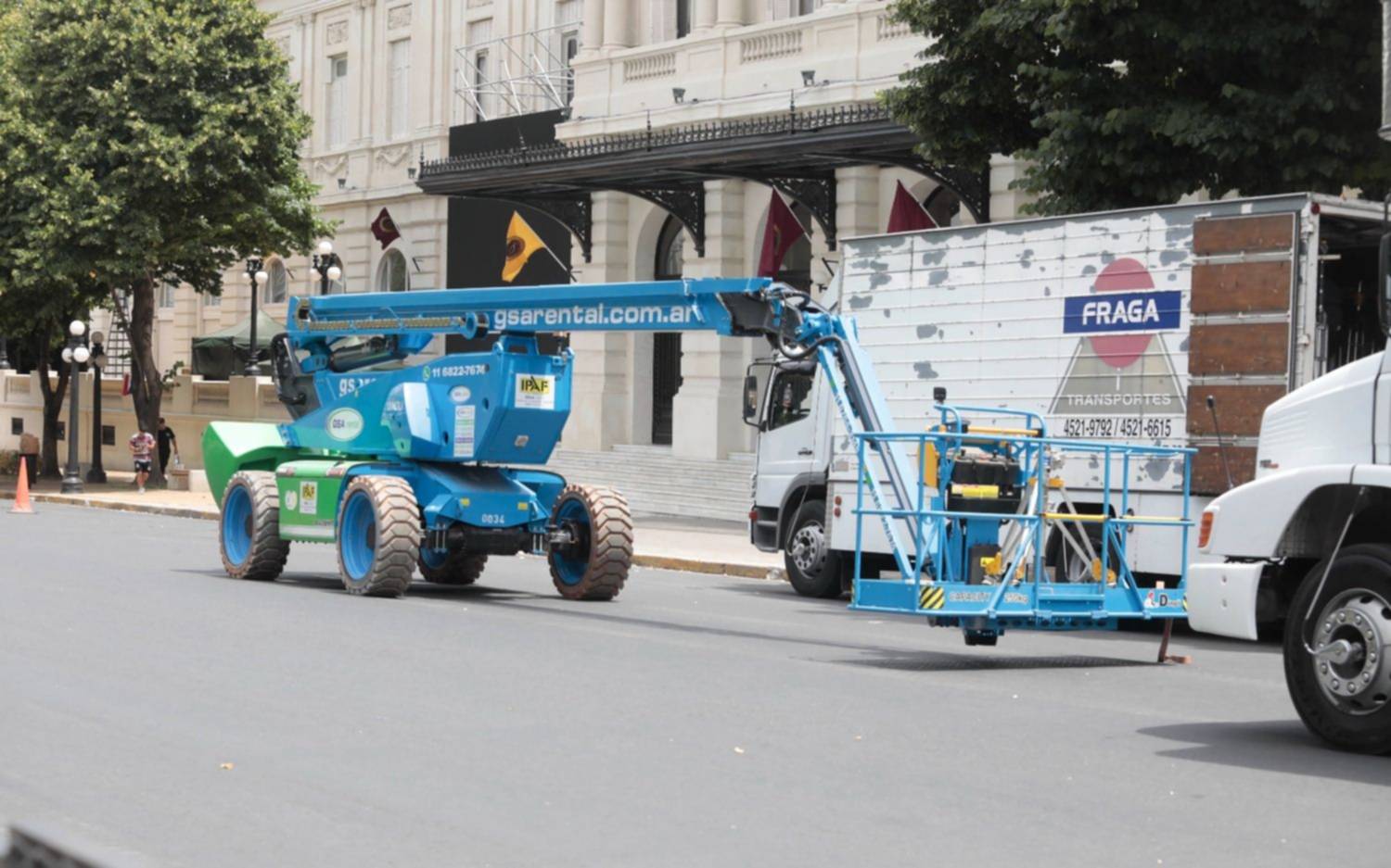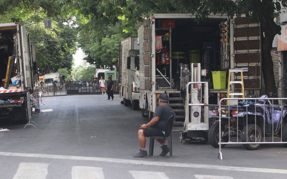 Durante la tarde, grúas y personal técnico trabajan intensamente en el montaje de las estructuras, mientras agentes de seguridad y producción coordinaban los últimos detalles logísticos. Aún resta el arribo de los vehículos que completarán la puesta en escena, paso previo al inicio formal de las grabaciones.