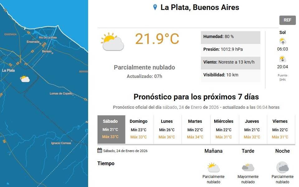 Este sábado comenzó en La Plata y alrededores la ola de calor que se instalará al menos hasta el próximo jueves. Para este sábado, el Servicio Meteorológico Nacional (SMN) anunció cielo parcialmente nublado a mayormente nublado hacia la tarde y temperatura mínima de 21ºC y máxima de 33ºC.