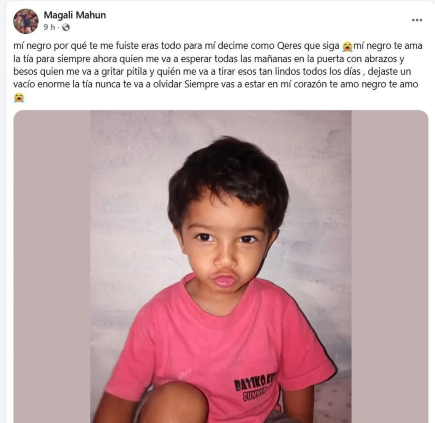 “Dejaste un vacío enorme. La tía nunca te va a olvidar. Siempre vas a estar en mi corazón. Te amo negro, te amo”, cerró la desgarradora carta acompañada por una fotografía del niño.