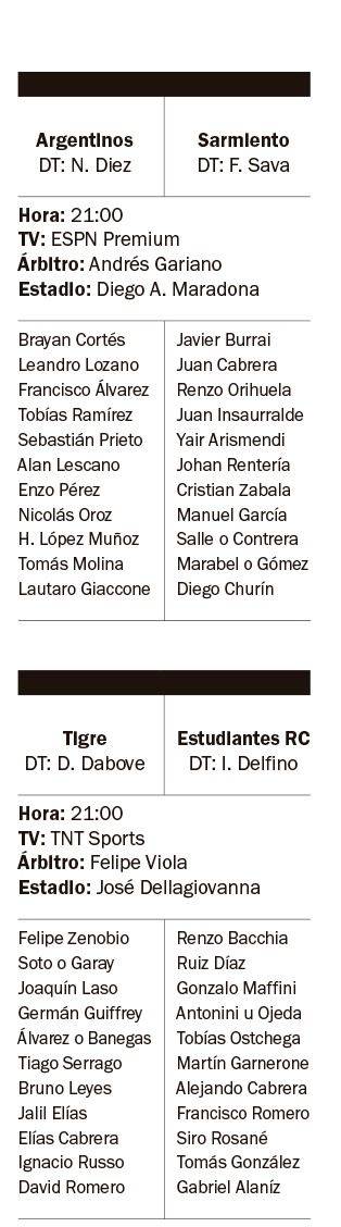 Por su parte, Tigre y Estudiantes de Río Cuarto jugarán hoy a partir de las 21 en el Estadio José Dellagiovanna. El elenco de Victoria abre una temporada en la que disputará triple competencia frente al flamante recién ascendido. Justamente, Estudiantes de Río Cuarto hará su estreno en la máxima categoría, cuyo principal objetivo para esta temporada es mantener la categoría.