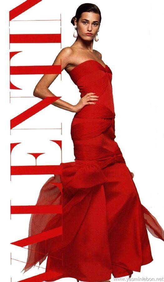 Yasmin Le Bon, con un vestido sin tirantes en el clásico rojo Valentino de la colección Primavera/Verano 1987 de Valentino. Fotografiado por David Bailey / PINTEREST