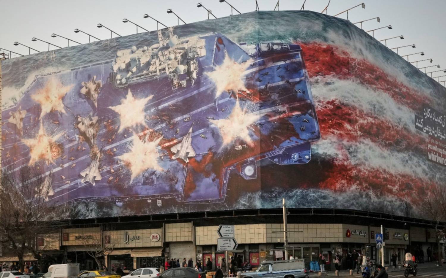Irán elevó el tono de su advertencia a Estados Unidos al revelar un mural en una plaza central de Teherán que anticipa represalias ante un eventual ataque militar. La obra muestra aviones dañados sobre un portaaviones y el mensaje “Si siembras el viento, cosecharás la tempestad”. El gesto coincide con el despliegue del portaaviones USS Abraham Lincoln hacia la región y con declaraciones de Donald Trump, quien afirmó mantener “todas las opciones abiertas” frente a la escalada de tensiones entre ambos países.