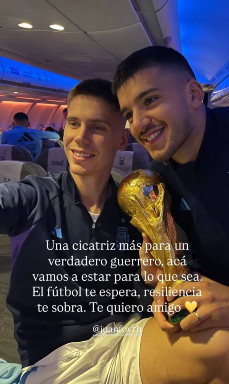 Por esos años juntos a la par, el arquero no dudó en brindarle apoyo a su viejo amigo, a través de una historia de Instagram, en donde publicó una foto de ellos dos junto a la Copa del Mundo, con un texto que decía: “Una cicatriz más para un verdadero guerrero, acá vamos a estar para lo que sea. El fútbol te espera, resiliencia te sobra. Te quiero amigo”.