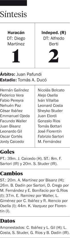 Independiente Rivadavia abrochó anoche el segundo triunfo al hilo en el Apertura, tras superar a Huracán por 2-1 en Parque de los Patricios, en un partido que lo pudo dar vuelta en el complemento.