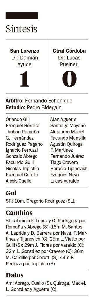 Con gol de Gregorio Rodríguez a los 10 minutos del segundo tiempo, San Lorenzo consiguió su segunda victoria consecutiva al ganarle por 1 a 0 a Central Córdoba de Santiago del Estero como local.