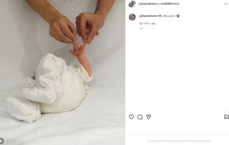 La publicación conjunta, titulada simplemente “Amadeo 2-01-26”, muestra las manos de los padres tomando los pequeños dedos del bebé, con un gesto que remite al icónico festejo del delantero, el “Hombre Araña”. Esa combinación de ternura y simbolismo futbolero se volvió viral en cuestión de minutos.