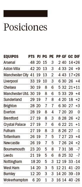 Con la victoria, el equipo de Mikel Arteta llegó a 48 puntos y mantiene seis puntos de ventaja sobre el Aston Villa, que se impuso 3-1 al Nottingham Forest, en un duelo en el que Emiliano Martínez y Emiliano Buendía fueron titulares. Ollie Watkins y un doblete del escocés John McGinn marcaron para los Villanos mientras que Morgan Gibbs-White descontó para el equipo del Bosque.
