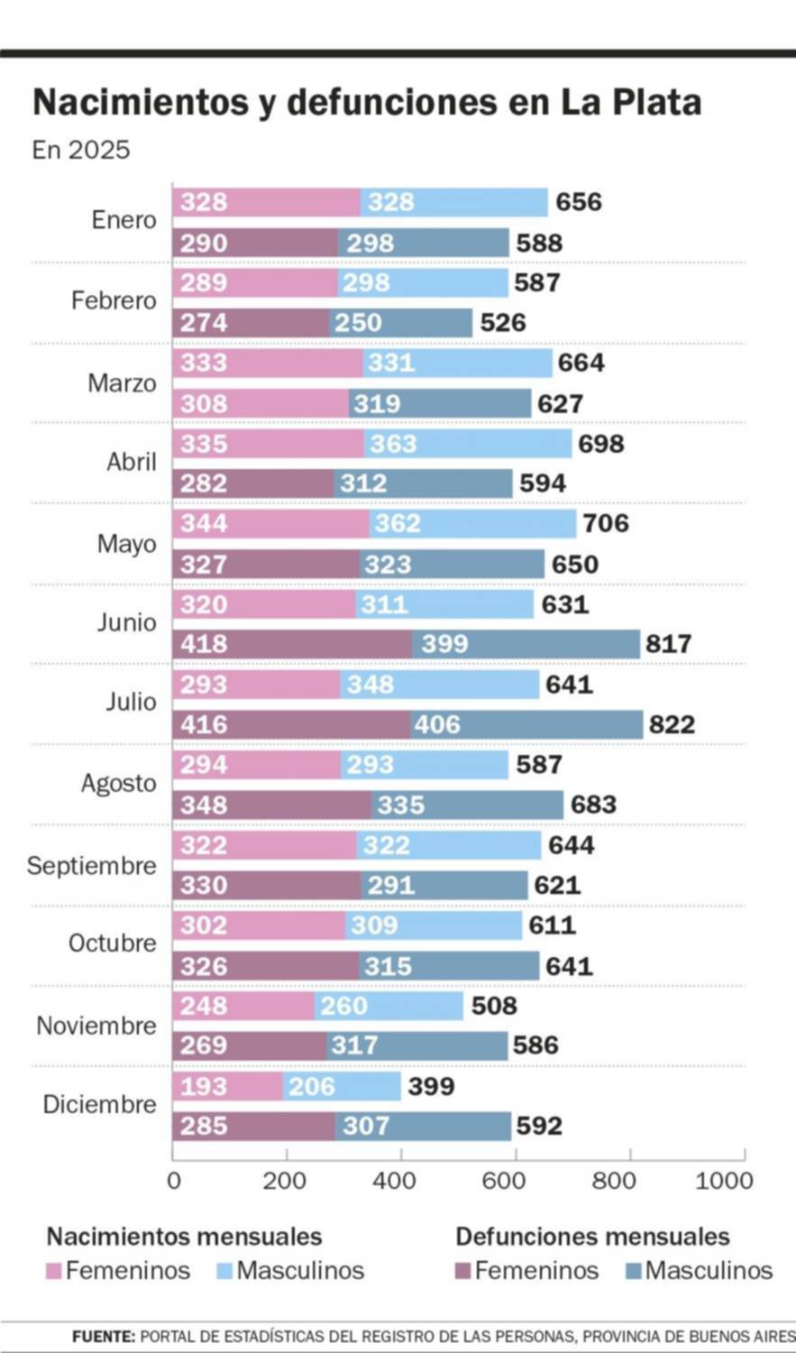 En este marco, La Plata no escapa al fenómeno. Según datos de la provincia de Buenos Aires, en 2025 hubo más fallecimientos que natalicios. Así lo advirtió el Portal de Estadística del Registro de las Personas bonaerense: el año pasado nacieron 7.332 personas mientras que murieron 7.745 (ver gráfico para visualizar la discriminación mensual).