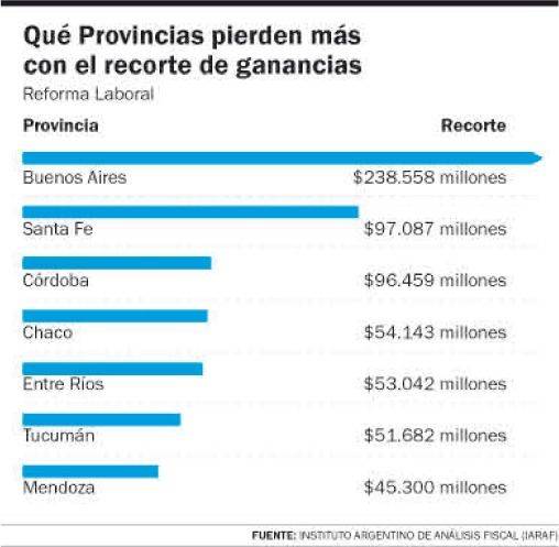 Según un análisis del Instituto Argentino de Análisis Fiscal (IARAF) la provincia de Buenos Aires asumiría el recorte mayor con $238.558 millones, seguida por Santa Fe ($97.087 millones), Córdoba ($96.459 millones), Chaco ($54.193 millones), Entre Ríos ($53.042 millones), Tucumán ($51.682 millones) y Mendoza ($45.300 millones).
