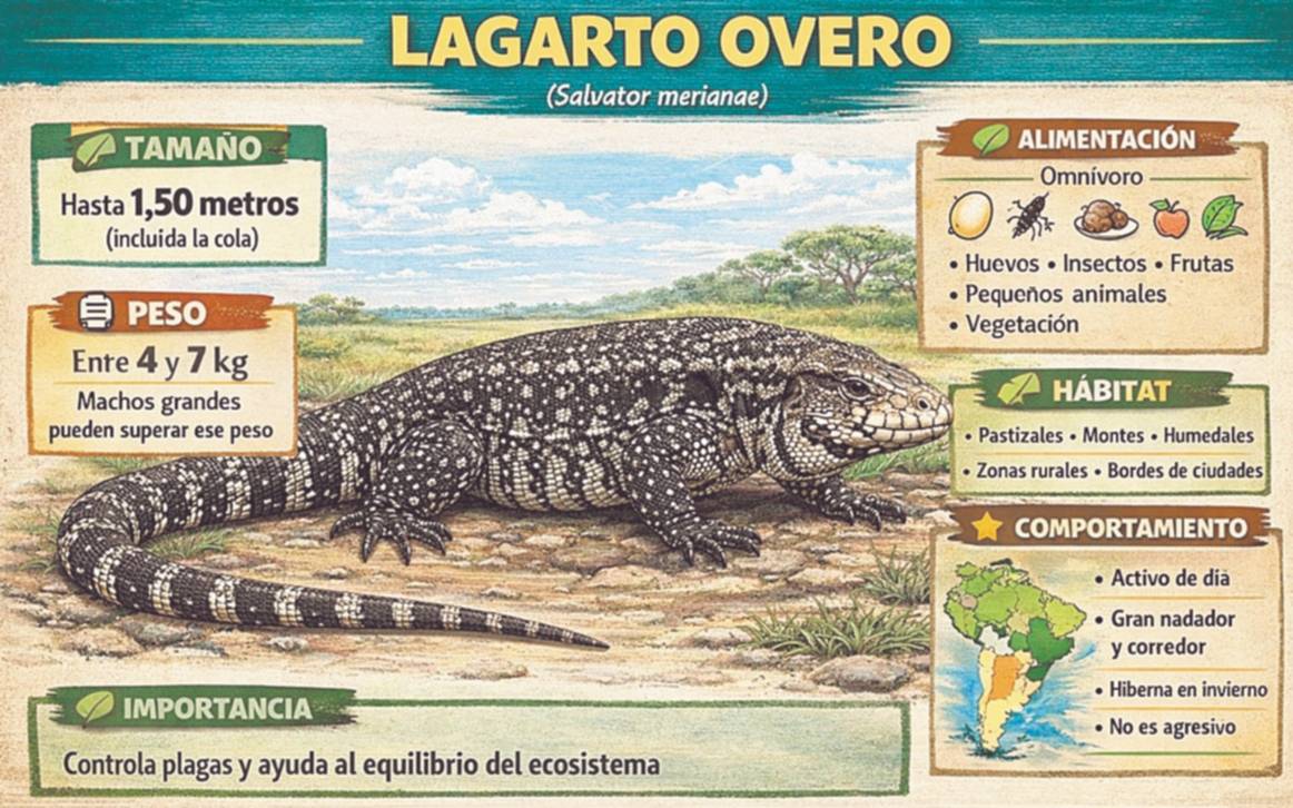 El protagonista de estos encuentros es el lagarto overo, también conocido como tegú argentino (Salvator merianae), un animal que forma parte del paisaje natural bonaerense desde siempre, pero que hoy se deja ver con mayor frecuencia en jardines, parques y zonas residenciales.