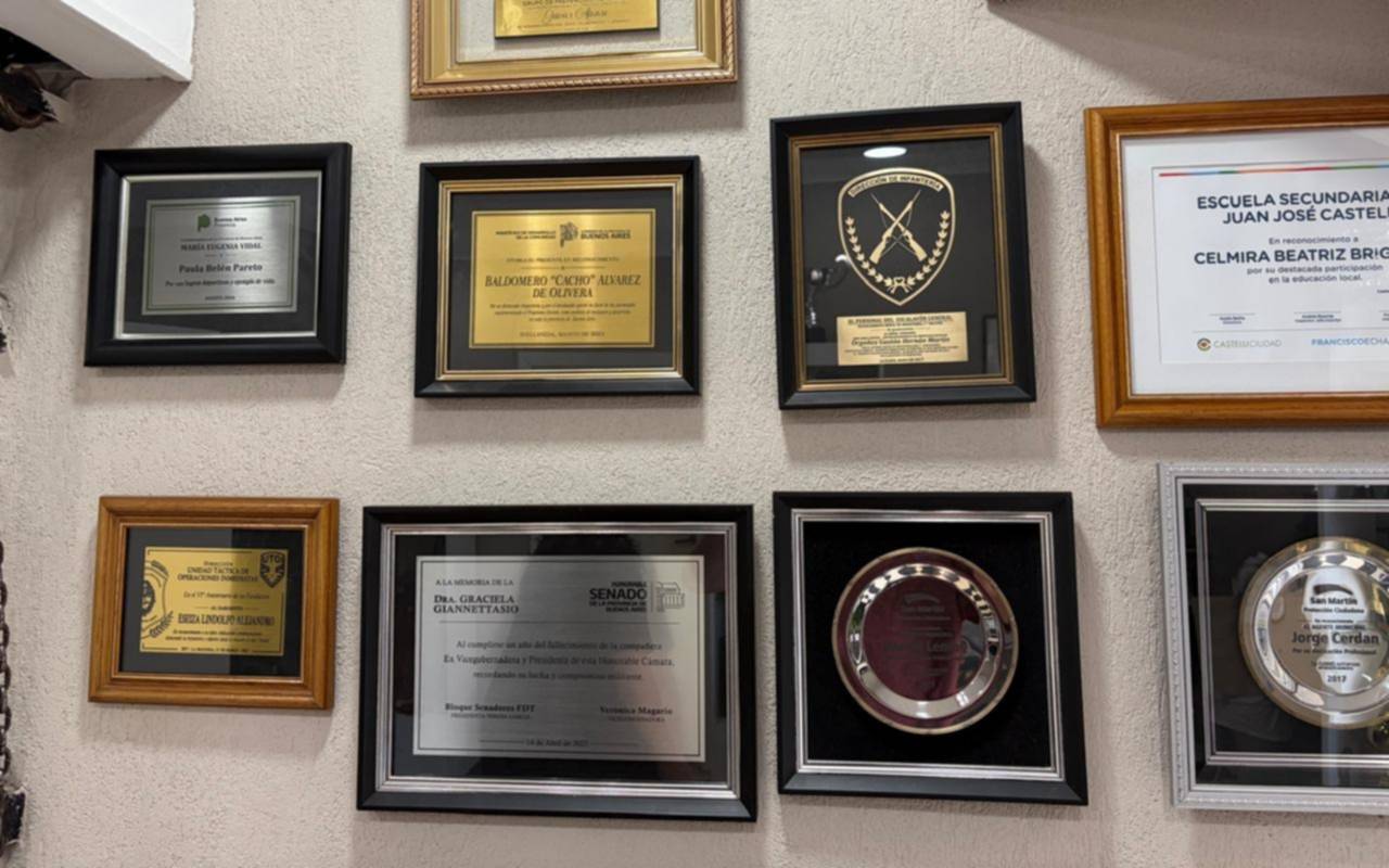 El taller produce desde placas institucionales, bandejas, platos, copas y medallas, hasta sellos, regalos protocolares, banderas, indumentaria y trabajos de enmarcado. Pero más allá del listado, lo que se respira en el lugar es otra cosa: una especie de archivo silencioso de momentos importantes, celebraciones y homenajes que atravesaron a la ciudad y al país.