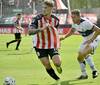 Franco Torres intenta bajar la pelota ante la marca del central. Gimnasia no pudo ante el guapo / Fotobaires