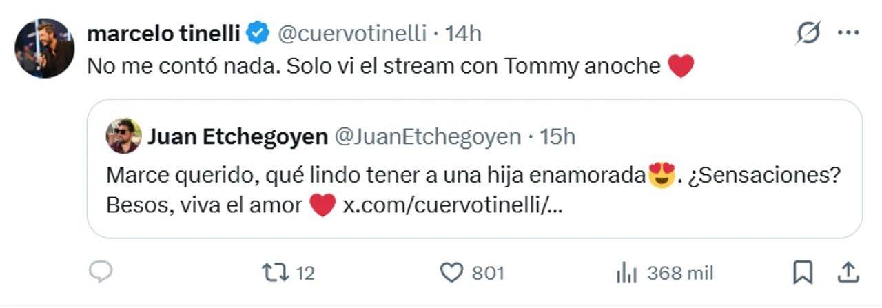La confirmación del romance entre Juanita Tinelli y Tomás Mazza revolucionó las redes sociales, generando diversas opiniones entre los usuarios. Sin embargo, el comentario que más destaco fue el de Marcelo Hugo, quien sostuvo que se enteró del romance de su hija gracias al streaming del influencer.