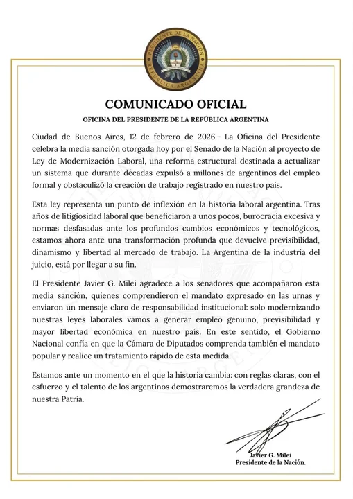 “El Presidente Javier G. Milei agradece a los senadores que acompañaron esta media sanción, quienes comprendieron el mandato expresado en las urnas y enviaron un mensaje claro de responsabilidad institucional: sólo modernizando nuestras leyes laborales vamos a generar empleo genuino, previsibilidad y mayor libertad económica en nuestro país”, expresó.