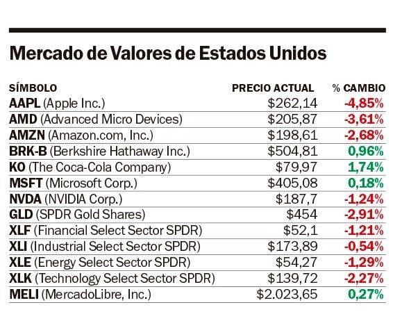 Ayer, el mercado también se vio lastrado por nuevas ventas de valores tecnológicos. Nvidia cayó un 1,24%, Apple casi 5% y Meta un 2,82%.